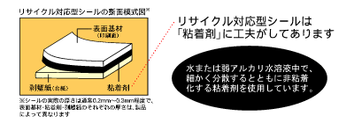 シールなど粘着剤を使用した紙製品は、製紙原料として利用困難な古紙とされています。このため、例えば書店から返本された雑誌にシールが折り込まれている場合は、回収された雑誌の製紙原料化のため、シールを除去するなどの作業が必要です。また、除去されたシールは焼却などにより廃棄処分され、リサイクルされていませんでした。しかし、近年、水または弱アルカリ水溶液中で、細かく分散するとともに非粘着化する粘着剤の使用により、雑誌本体とともに製紙原料化が可能なリサイクル対応型シールが開発・商品化されています。リサイクル対応型シールの普及により、雑誌に折り込まれたシールの除去が不要になる他、シールのリサイクル拡大が期待されています。